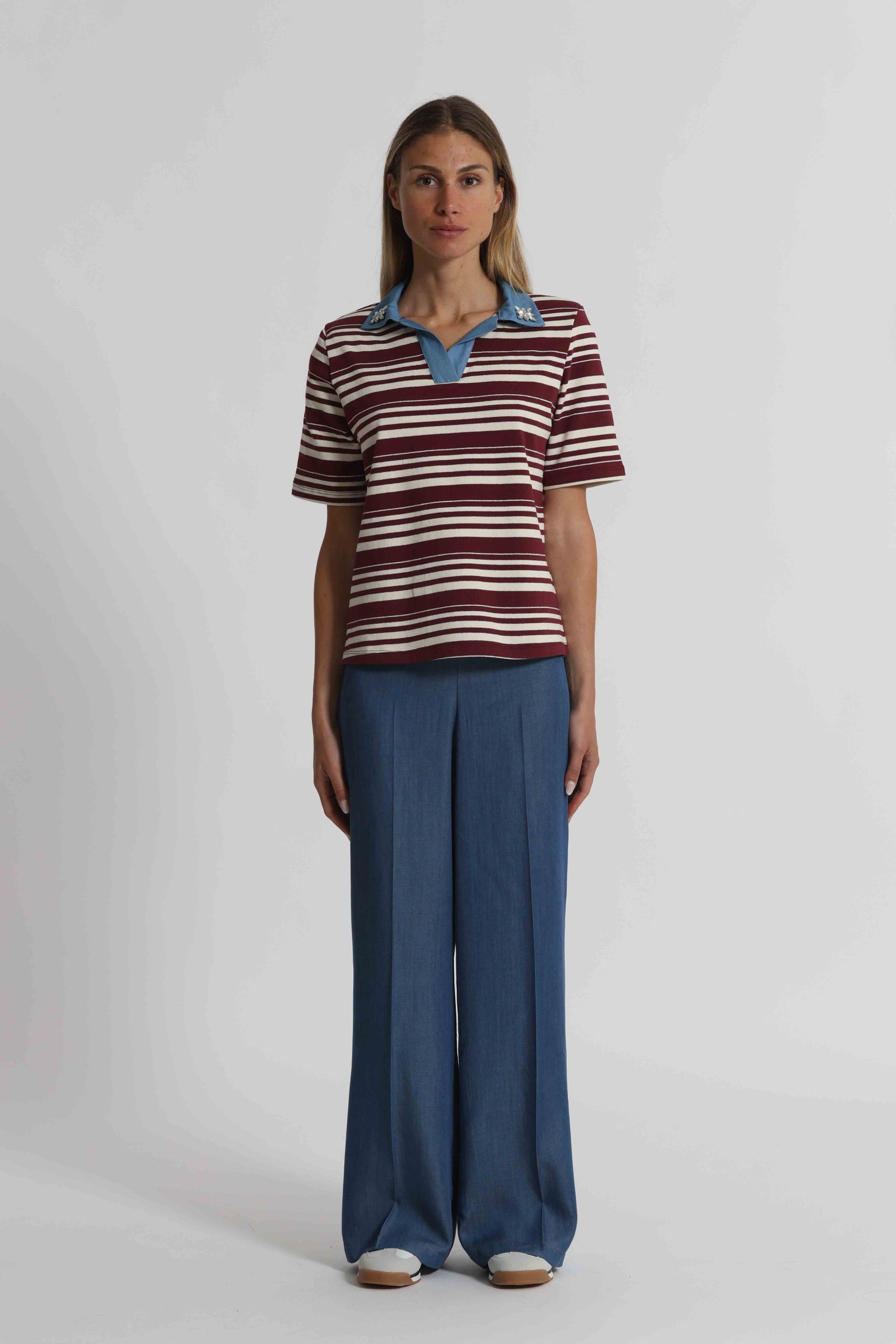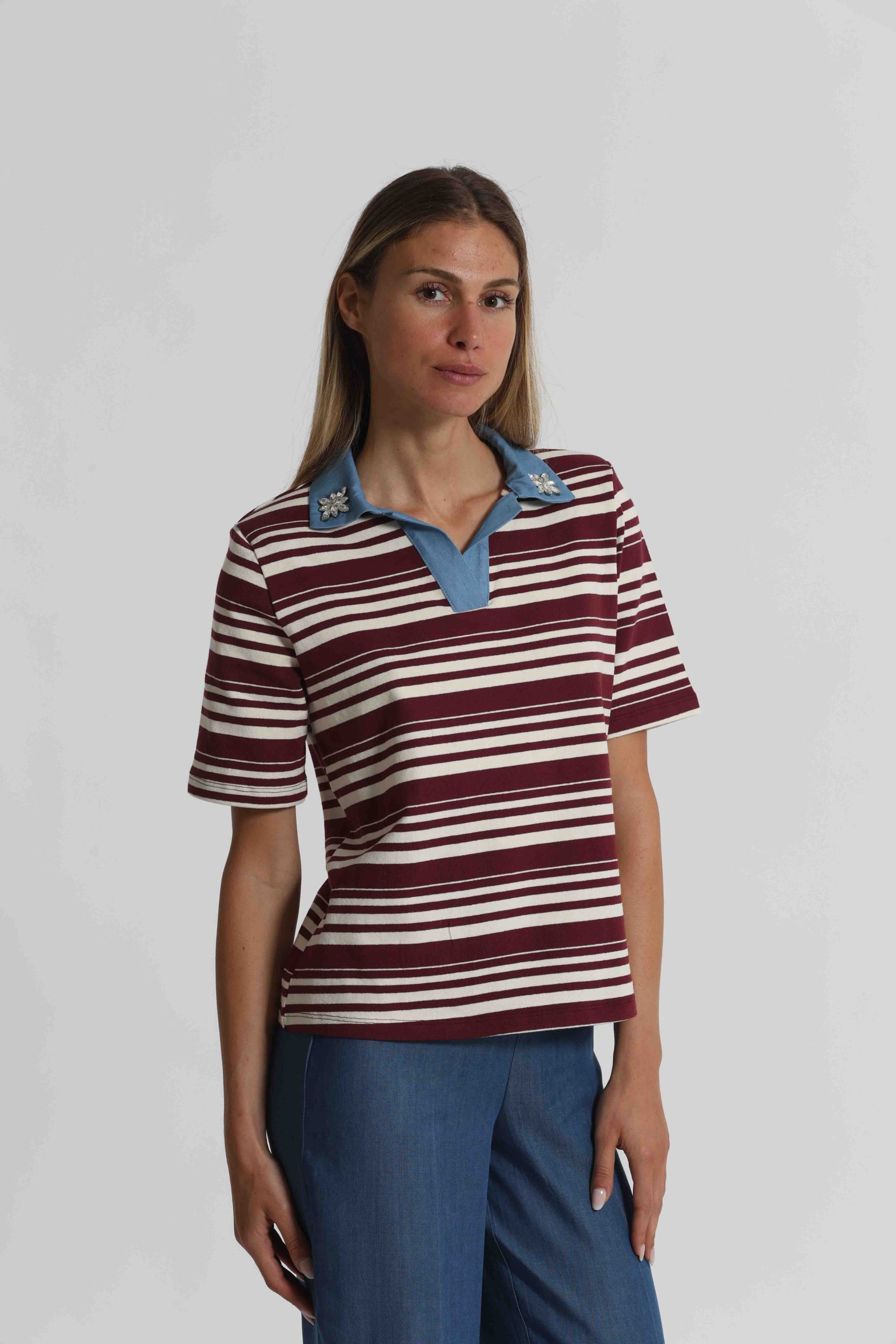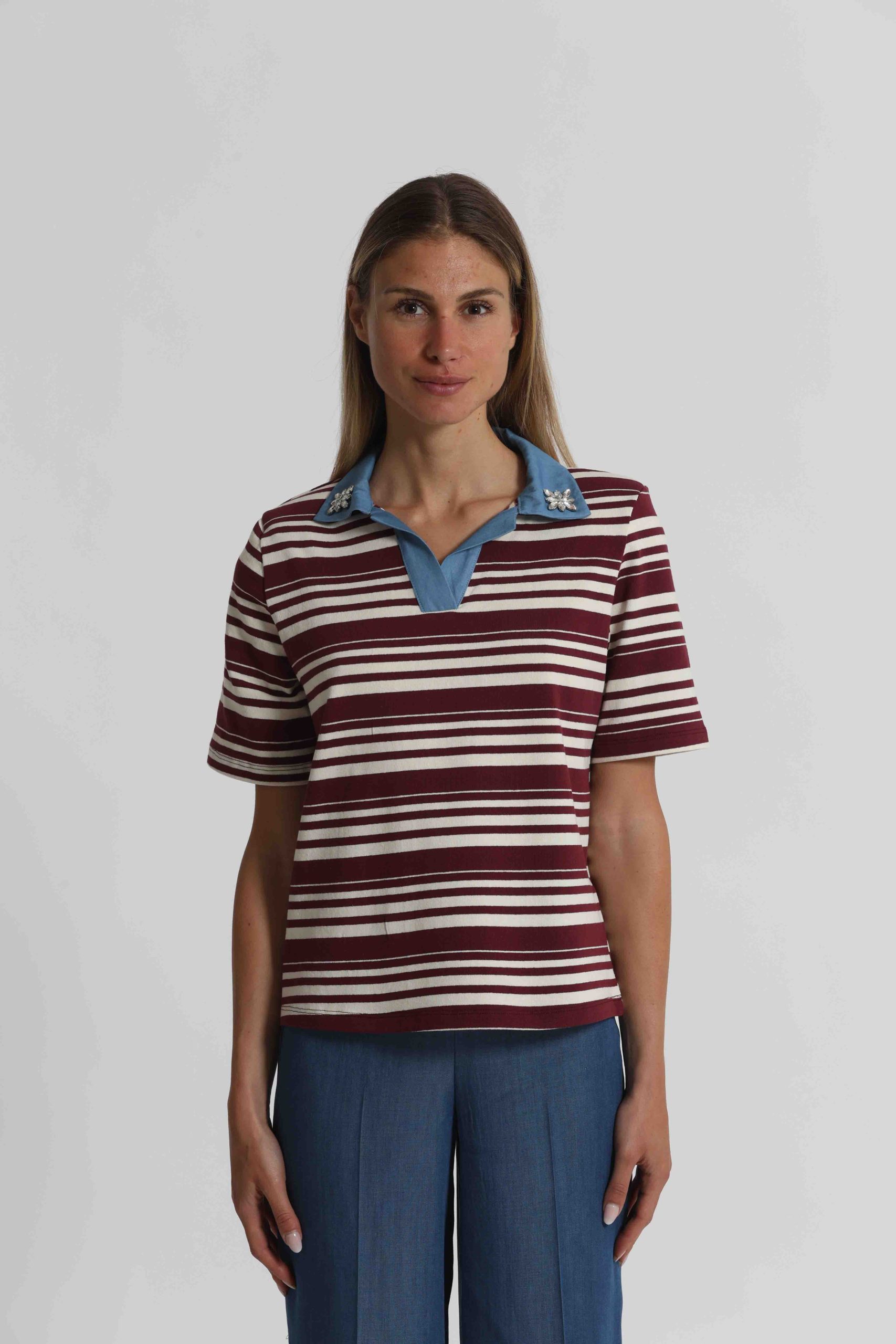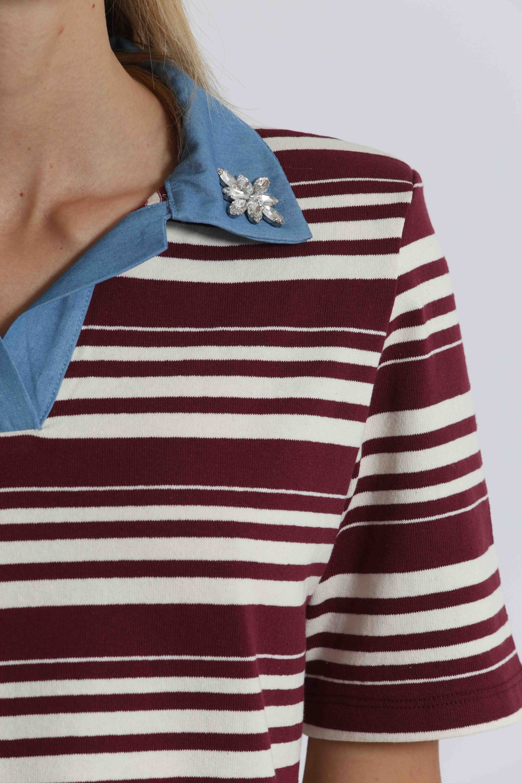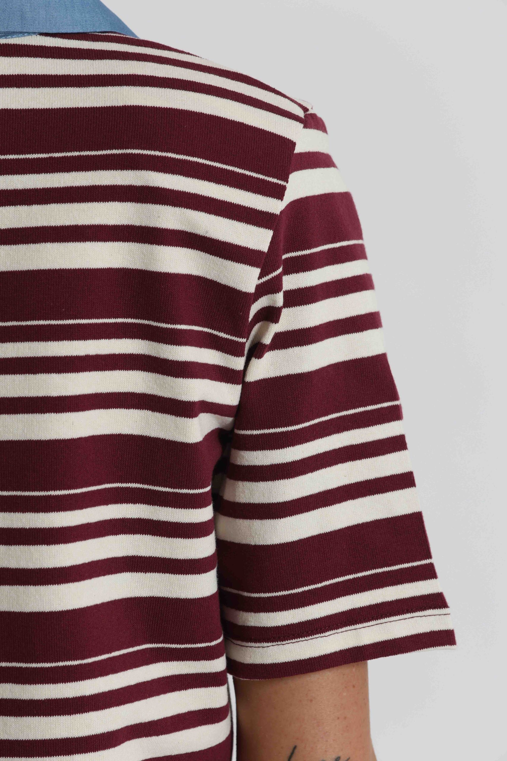 T-Shirt a righe con colletto denim e inserti in st-Bordeaux/panna